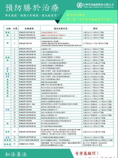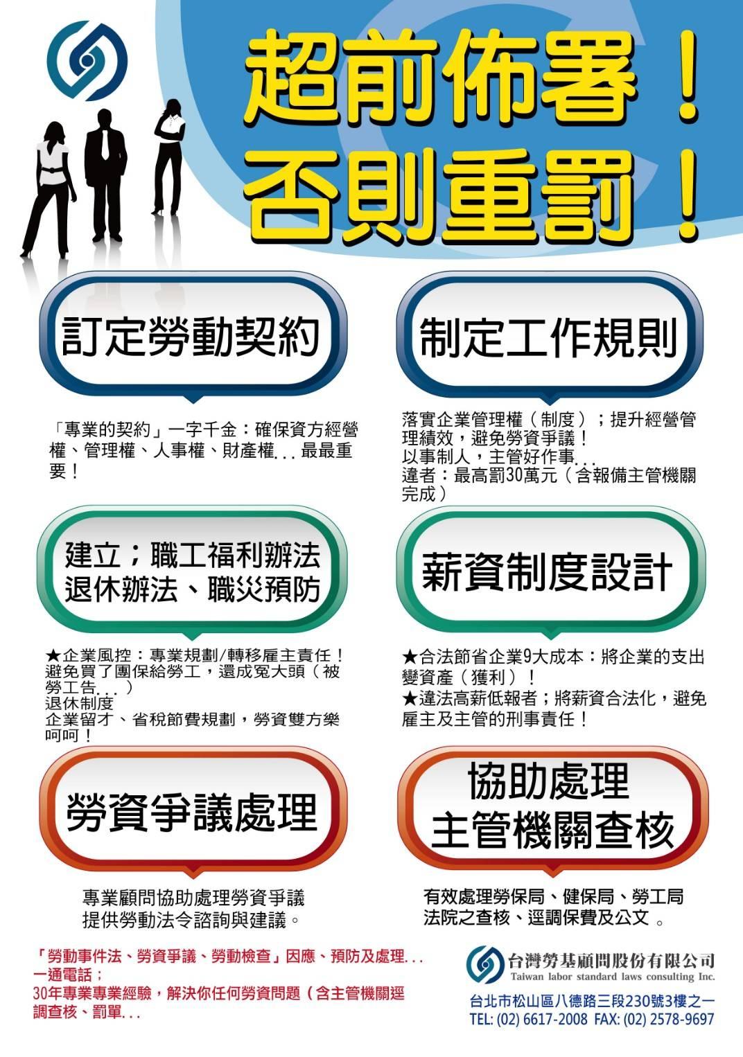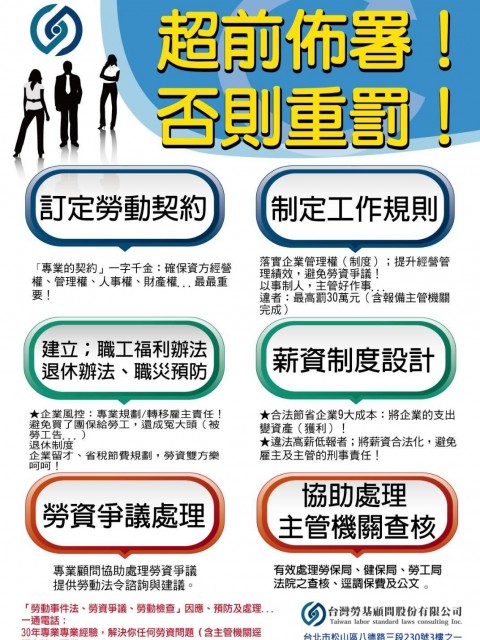 勞基顧問:專業協助業主,建立符合勞基法的規範,讓企業主依法合法經營。