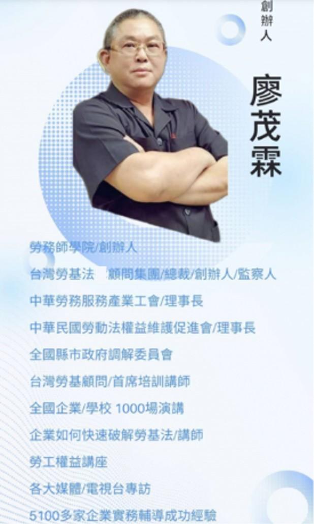 台灣勞基法顧問集團,簡稱『勞基顧問集團』。創辦人廖茂霖先生 鑑於〝勞資雙方〞對於勞動法令的不了解,進而產生許多勞資糾紛事件(求職蟑螂、慣老闆…),動輒到主管機關勞工局調解,甚至於到法院訴訟,浪費許多社會成本,特培訓並結合一群對勞動法令之專業顧問共同組成『勞基顧問集團』。