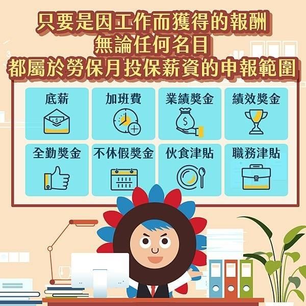 月薪資總額非僅以底薪或所謂固定薪資為申報基準,如加班費、伙食津貼、全勤獎金、交通津貼、績效獎金、生產獎金、工作獎金……等,凡屬勞工因工作而獲得的報酬,均須併入月薪資總額計算。