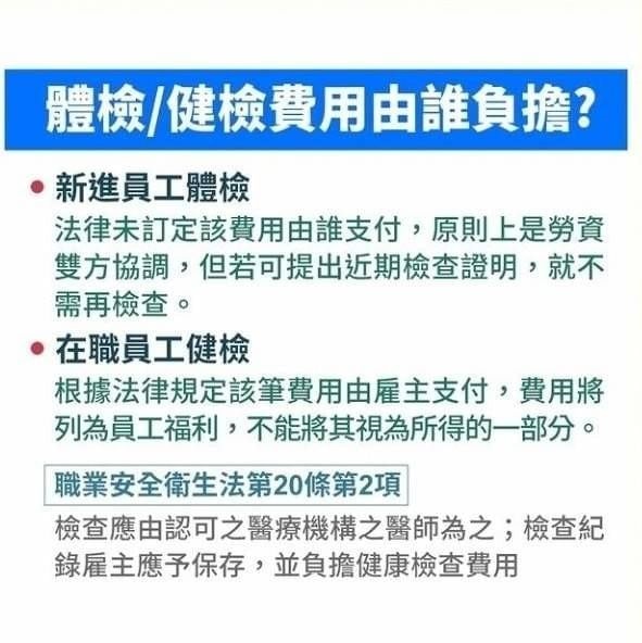 另外,#若屬法定的在職勞工健檢,#則應由雇主負擔其費用喔!若雇主未依規定辦理,若經主管機關通知限期改善,屆期未改善,則可能處以3~15萬的罰鍰喔!