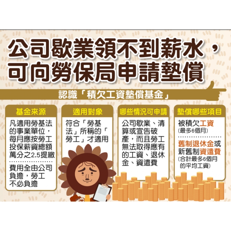 公司因經營不善 ★最終宣告倒閉, 領不到薪資及資遣費, 員工面臨經濟困境…… Q:是否有其他相關的給付項目或補助,可供申請呢? A:勞動基準法第28條訂有「積欠工資墊償基金」制度。 【公司因有提繳積欠工...